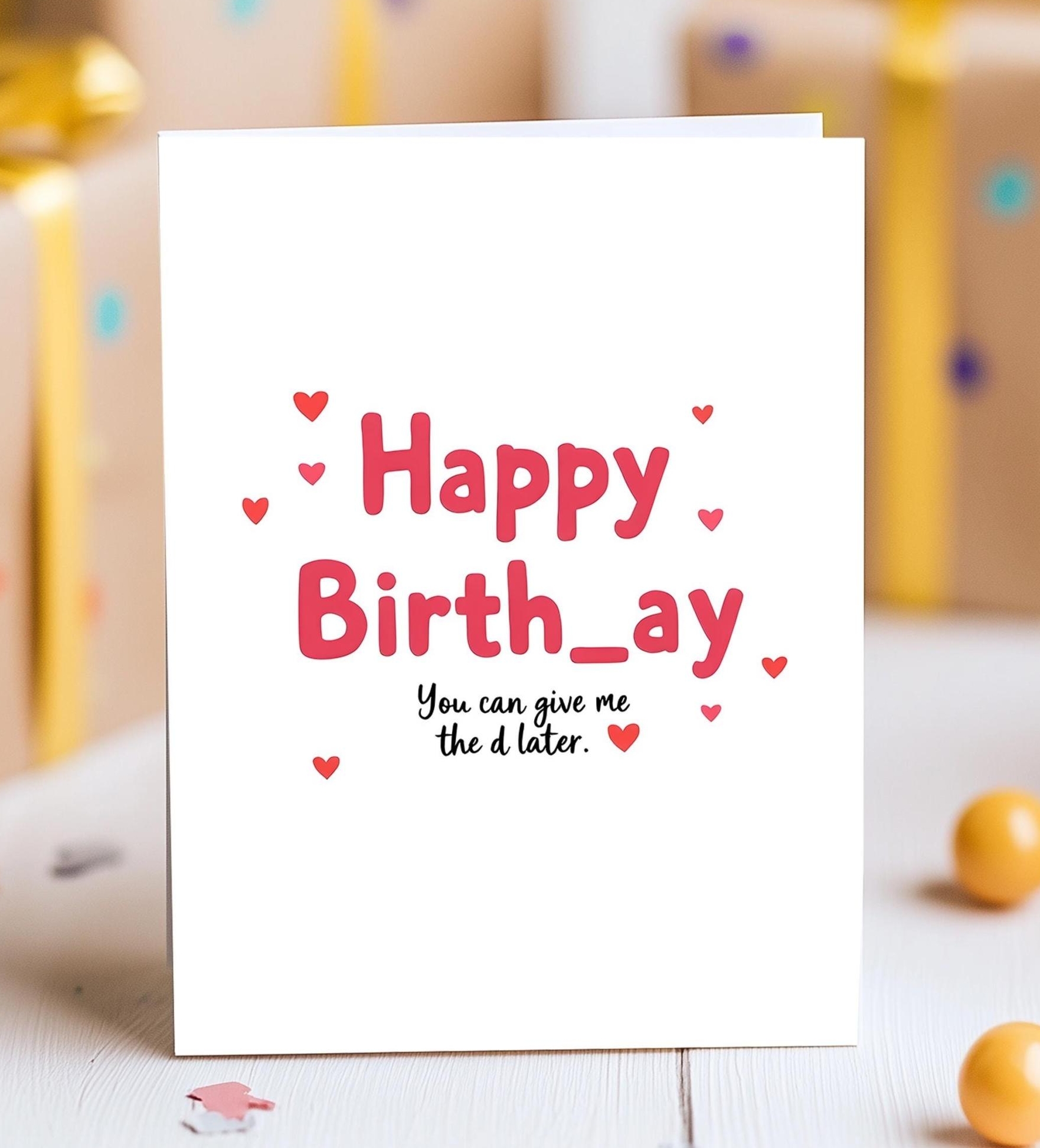 Featuring bold pink text that says “Happy Birth_ay” with a hilarious follow-up in black cursive – “You can give me the D later” – this card blends romance and innuendo in a way that will definitely make him laugh (and maybe blush). Adorned with sweet red hearts and printed on a crisp white background, it’s perfect for modern couples who enjoy keeping things fun and a little bit naughty.